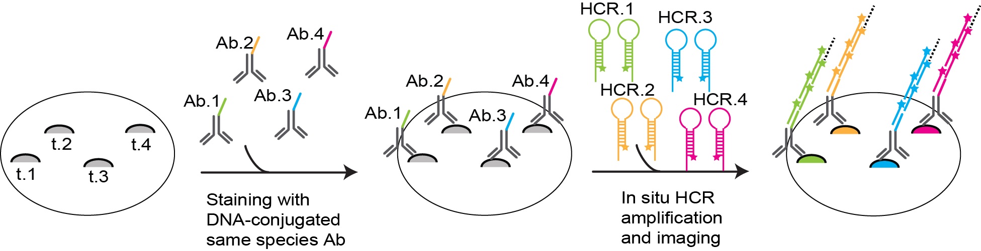 Yin, George M. Church. “Multiplexed in situ protein imaging using DNA barcoded antibodies with extended hybridization chain reactions” bioRxiv, 2020, 274456v3.